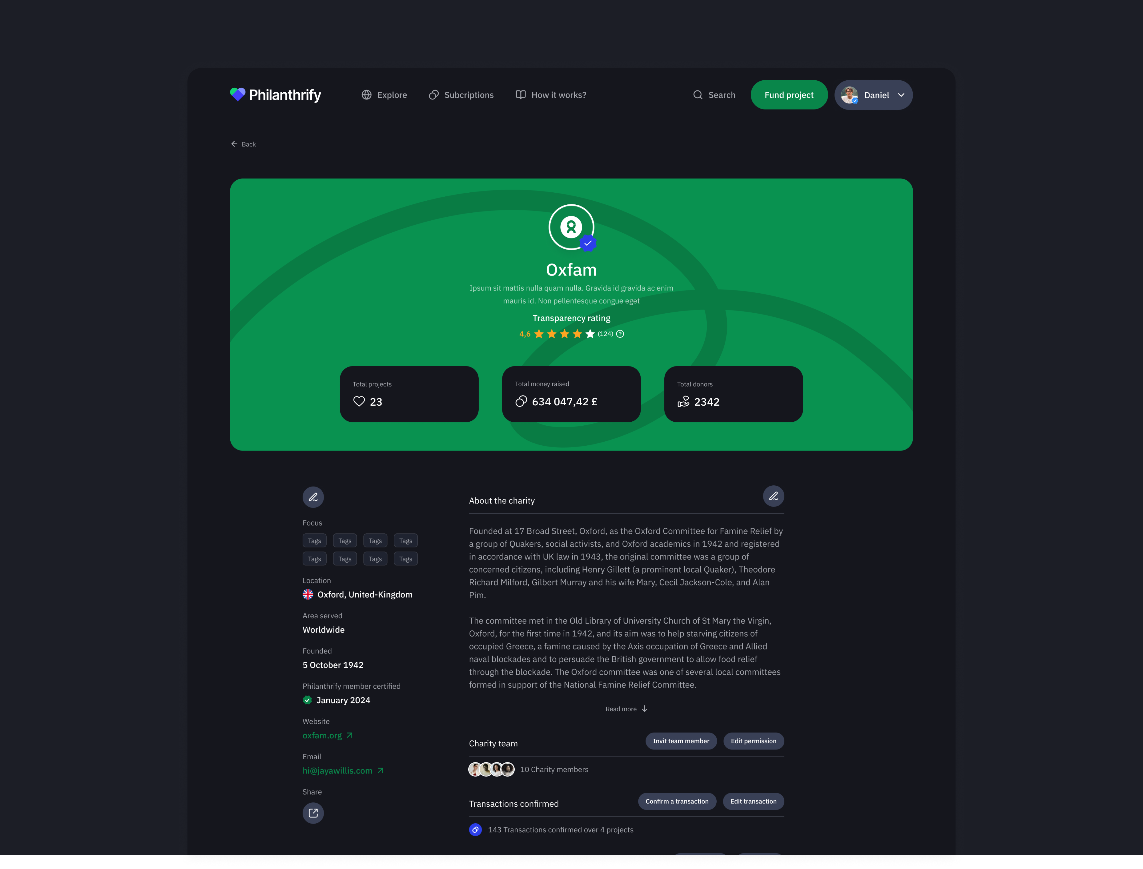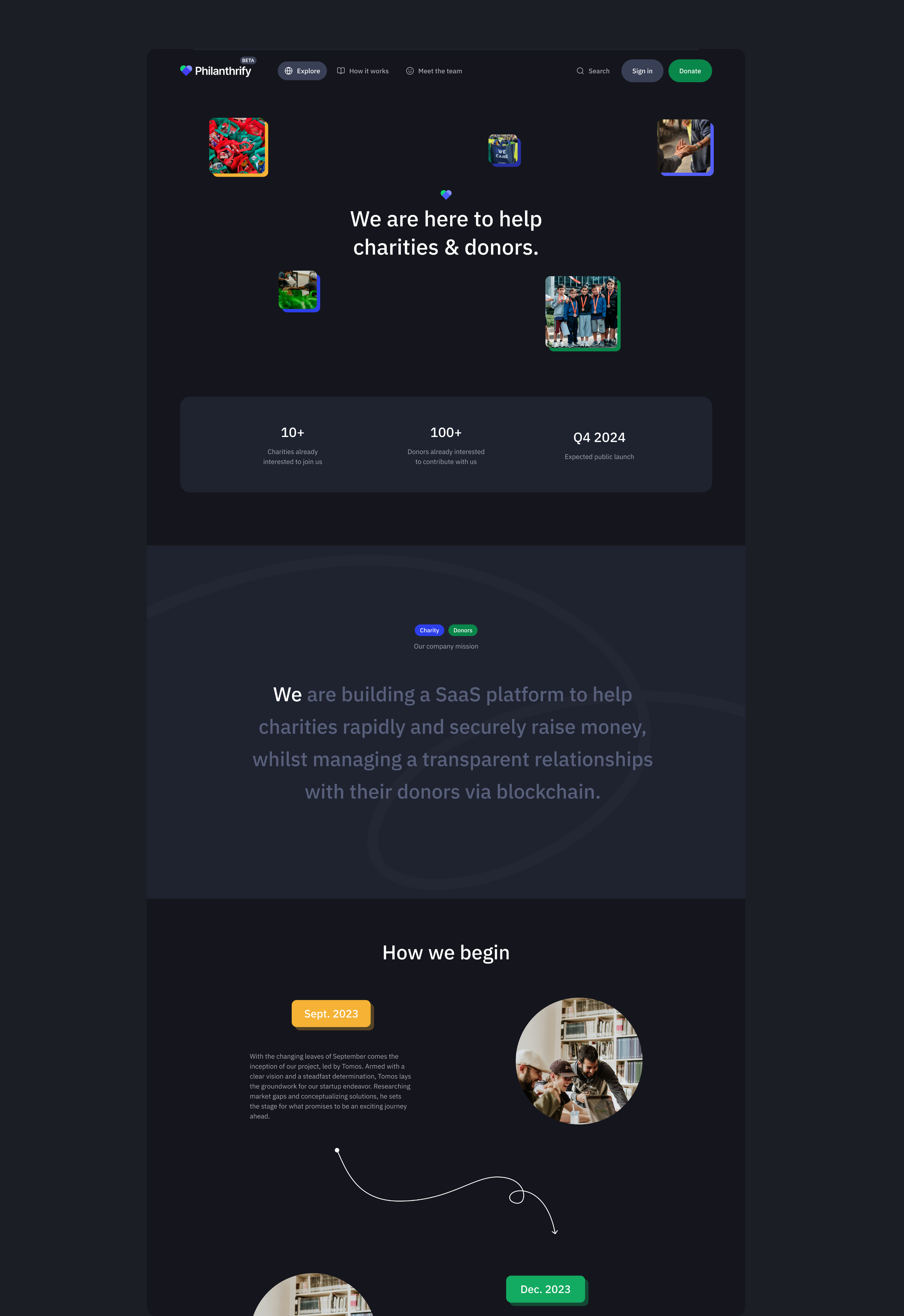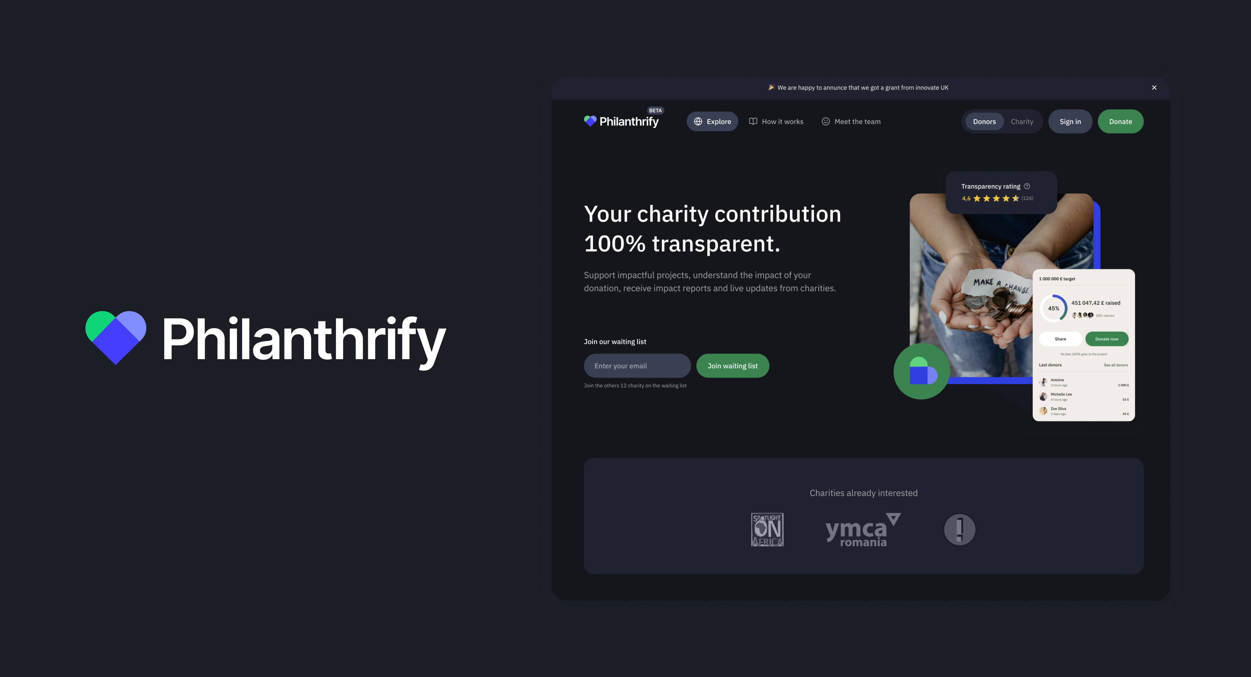 SaaS startup pushing the boundaries of technical excellence in the charity industry. By proving the impact of donations to charities, we provide a needed connect between the donor and the end beneficiary. To that end we are also providing charities with needed services (in a SaaS approach) to help with website design, marketing campaigns, grant applications and other services that may be difficult to achieve for non-technical trustees.