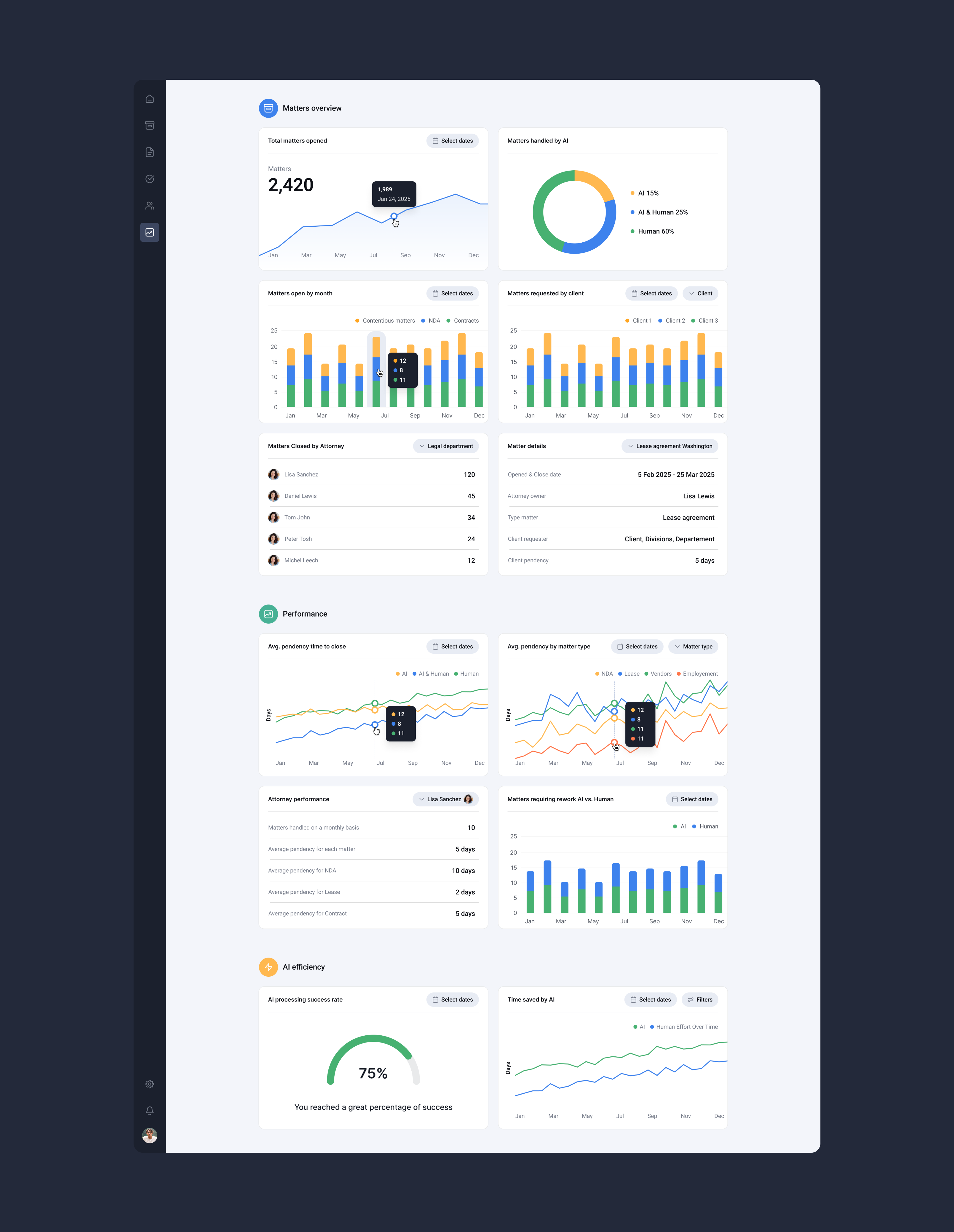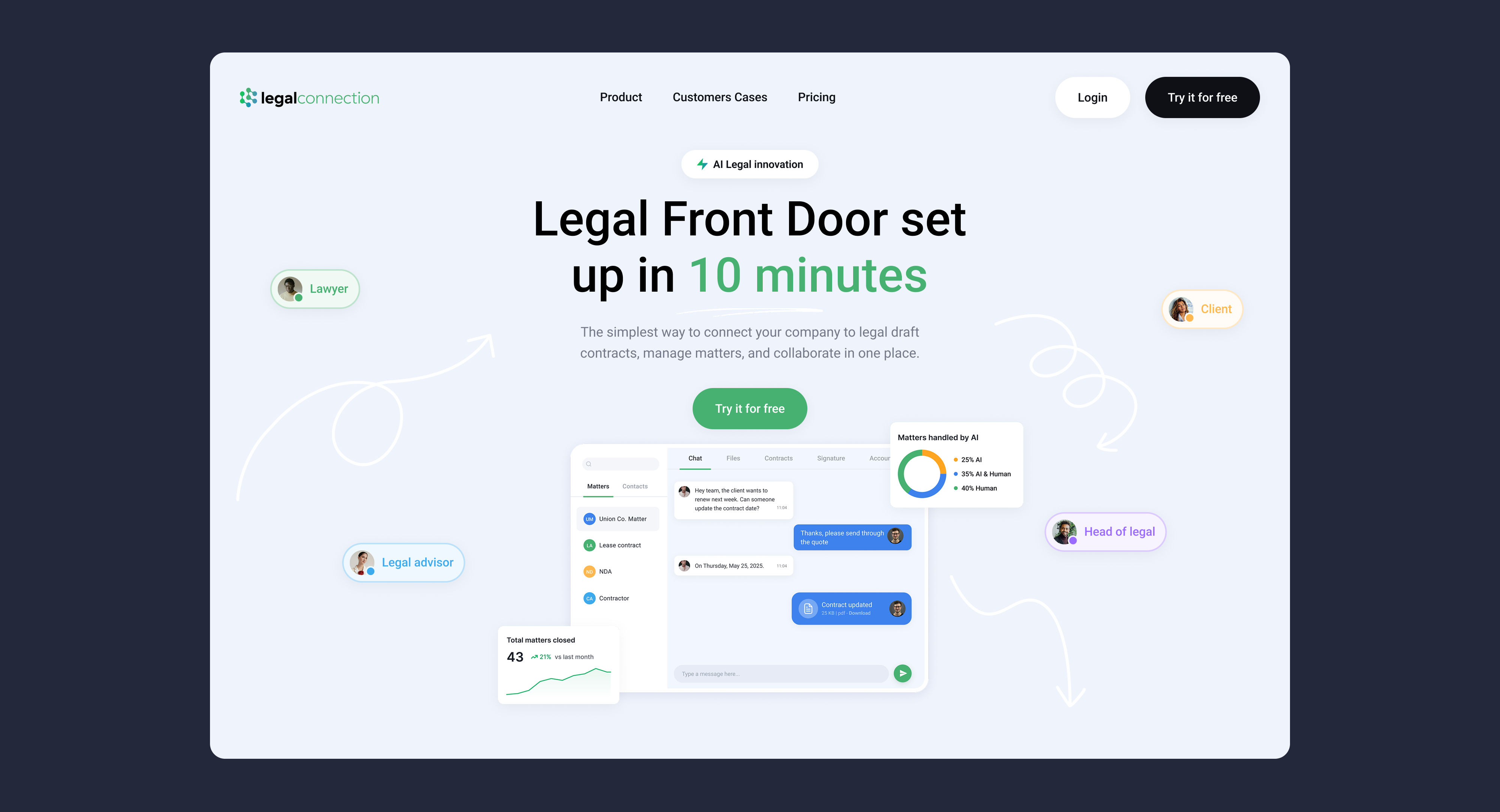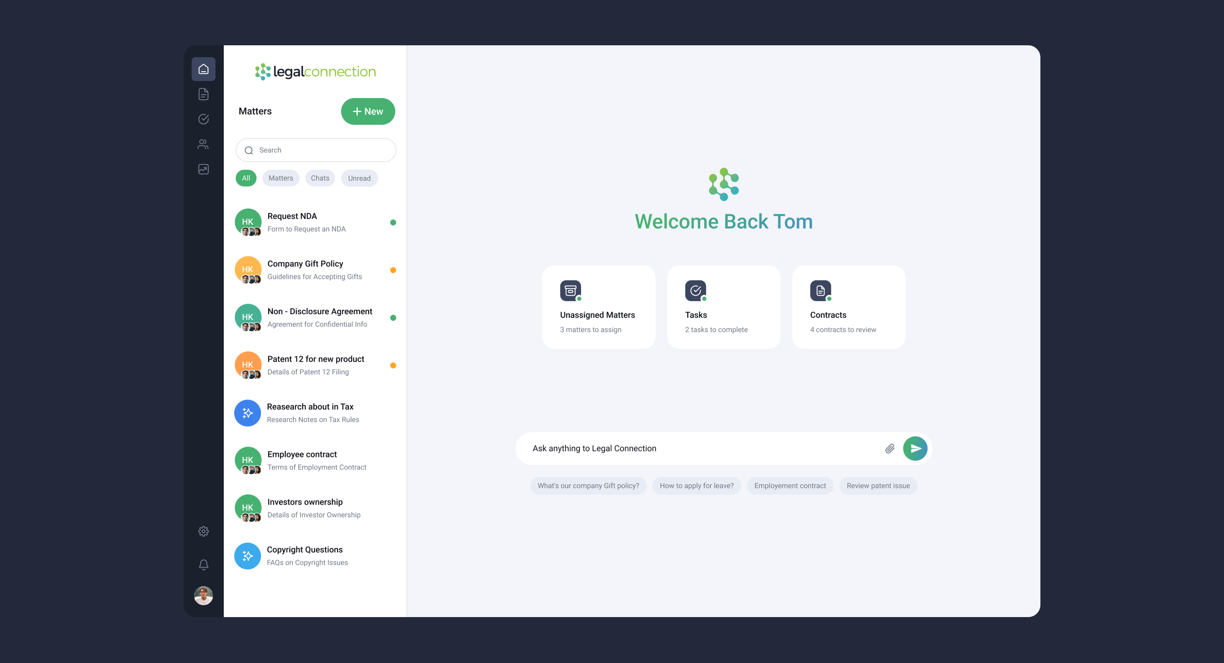 Legal Connection is a case and practice management system designed for lawyers, law firms, and in-house legal teams. Lawyers and legal teams can efficiently close contracts or resolve legal issues by leveraging an AI assistant to find the best legal solutions. Additionally, the integrated messaging system facilitates quick and effective communication, even for complex contract negotiations.